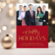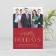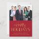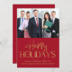 Elegante y moderna tarjeta de vacaciones de negocios de color rojo rojo para mostrar la apreciación de sus clientes en esta temporada de Navidades con una foto de su equipo de la empresa y "Happy Holidays" en Relieve metalizado de imitación dorada y tipografía única. Personalice su línea de firma y nombre de la empresa.