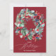 Felices fiestas, Celebren los Navidades y la temporada invernal con esta corona botánica pintada de color rojo, azul marino y verde con flores, bayas sagradas, ramas de pino con un fondo editable de manteles rojo oscuro y dorado.