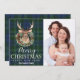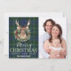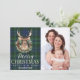 Hermoso ciervo acuarela con corona azul y verde tartán. El texto de las vacaciones dice Feliz Navidad y Feliz Año Nuevo. Esta tarjeta plana de vacaciones tiene un área de fotos lista para su reemplazo. Personalizar el texto del nombre en la parte inferior.