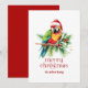 Este festivo diseño de temática de Navidades tropicales -Feliz Navidad- hermosa tipografía retro roja con un pájaro de Navidades tropicales con un sombrero de Santa. Nombre de familia personalizable.
