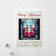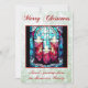 Vidrio brillante y brillante de diseño de vidrios de Navidades multicolores con velas frente a una ventana ornamentada, en un marco rojo. Con un fondo purpurina verde pálido y "Feliz Navidad". Puede cambiar el saludo personal del personalizable al final del diseño a su propio mensaje.