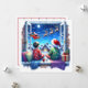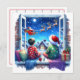 Tarjeta de Navidad personalizada nostálgica adorable. Gráfico de acuarela linda de niños sentados en la ventana viendo a Santa Claus y los renos volar por el cielo en una Nochebuena estrellada.