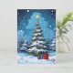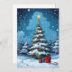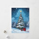 Un majestuoso árbol de Navidad se erige como pieza central, adornado con nieve brillante y adornos rojos vibrantes, coronado con una estrella dorada. Rodeado por un paisaje invernal sereno y flanqueado por regalos envueltos en colores alegres, esta imagen captura la esencia mágica de la Navidad. La suave nevada y la tranquila atmósfera de los árboles cubiertos de nieve en el fondo crean una escena pacífica, perfecta para difundir la alegría navideña.