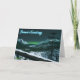 Una escena nocturna en el extremo norte. La noche ha caído y hay un indicio de las luces del norte más allá de las montañas en el horizonte. La luz de la luna refleja el paisaje cubierto de nieve. Un búho se sienta en un abeto muerto buscando voles. El texto que dice "Saludos de temporada" aparece en azul y blanco resplandeciente.