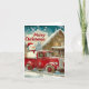 Esta encantadora escena de invierno cuenta con un camión rojo de cosecha que lleva a un animado muñeco de nieve en la parte trasera. El camión, adornado con una decoración de copos de nieve en la puerta, está cubierto por una manta de nieve. Al fondo, una casa de madera con tejado de nieve y músculos colgados de los aleros crea un ambiente festivo. Los copos de nieve caen suavemente de un cielo lleno de nubes azules y blancas, mientras que el texto "Feliz Navidad" aparece de forma prominente en letras rojas, capturando la esencia de una celebración tradicional y nostálgica de las fiestas.
