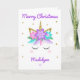 Este diseño de tarjetas para Navidades presenta un bonito diseño de caras de unicornio morado con flores y falsas estrellas purpurinas de oro. Personalice la parte delantera con un nombre y el mensaje dentro de la tarjeta con su propio texto o elimínelo para una tarjeta en blanco.