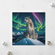 “Northern Sky Wanderer” – Snow Leopard Portrait. Against a sky streaked with dancing auroras, a snow leopard sits in quiet command atop a frozen summit. Though it belongs to southern mountains, here it becomes an otherworldly wanderer, impossibly at home in the shimmering night. The crisp air, glowing stars, and distant village lights merge into an enchanting tableau of wildness and mystery.