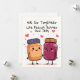 Celebre su pareja perfecta con esta adorable tarjeta de San Valentín de estilo cartoon que presenta frascos de mantequilla de maní y jalea tomados de la mano con corazones flotando alrededor. El texto juguetón dice: "Nosotros vamos juntos como mantequilla de maní y jalea", lo que la convierte en la tarjeta ideal para alguien que te completa. Ya sea tu pareja, mejor amigo o familiar, esta tarjeta es una forma divertida y dulce de decir "Estamos hechos el uno para el otro".