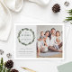 El elegante diseño de la tarjeta de fotografía navideña "New Home for the Holidays" también sirve como una invitación en movimiento. Anuncie su cambio de dirección a sus seres queridos esta temporada de vacaciones de invierno. La carta rústica y moderna incluye una imagen familiar (o foto de su nueva casa) junto a una corona de color laurel pintada de agua con trozos de pino, bayas y pinecones. El esquema de color neutro incluye colores verdes, plateados, grises claros y blancos crudos. Personalice su apellido y su nueva dirección. El fondo de la tarjeta está decorado con un fondo de color verde laurel.