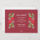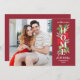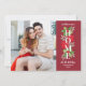 Esta moderna tarjeta de Navidades de tipografía floral para los nuevos propietarios de viviendas también es una tarjeta de invitación móvil. Anuncie su nueva dirección a la familia y amigos al comienzo de la temporada de tarjetas de vacaciones. La elegante tarjeta cuenta con una foto junto a un diseño acuático de invierno florido y verde con un superpuesto de texto "Home" simple y moderno. Incluye hojas y bayas huecas, flores de poinsettia y ramas de hojas. La redacción personalizado incluye "tenemos un nuevo hogar para las vacaciones" junto con un texto en el frente y en el reverso que puede ser personalizado. Fondo rojo rico con colores de diseño rojo, verde, gris y blanco.