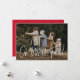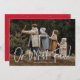 Cuta tarjeta de fotos de vacaciones con tu foto horizontal con "¡Oh qué diversión!" mostrada en un guión escrito a mano en blanco. Personalice la tarjeta de Navidades de fotos con su apellido y el año. La única tarjeta de vacaciones fotográfica se invierte para mostrar un fondo rojo con puntos blancos sutiles.