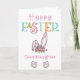 Tarjeta de Pascua personalizada linda y colorida. El diseño está escrito con "Pascua feliz" en tipografía caprichosa y decorado con orejas de conejo de Pascua rosadas, huevos de Pascua y patas de conejo. Puedes personalizar con un nombre o familiar en la parte frontal y tu propio saludo en el interior.