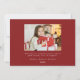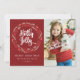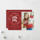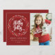 Envíe saludos de vacaciones a sus seres queridos con una tarjeta de Navidades de fotos. La hermosa tarjeta de vacaciones cuenta con una corona de adornos navideños y follaje de invierno en tonos rojos, burdeos, marfil y oro. La frase "Holly Jolly" se muestra en el centro de la corona con letras blancas con un fondo de color burdeos. Personalice la parte delantera de la tarjeta de Navidades agregando su foto, un saludo de vacaciones personalizado, su apellido y el año. La tarjeta vuelve a mostrar una foto adicional con espacio para un mensaje personalizado.