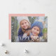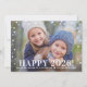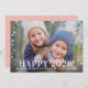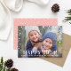 La moderna tarjeta fotográfica de Año Nuevo ofrece tu foto horizontal favorita con el diseño de texto "Happy 2024!" con texto personalizado y confeti con forma de borde. Personalice con un mensaje personalizado y sus nombres o apellidos. La parte posterior de la tarjeta presenta un color de fondo impreso en color oro/rosa subió (se puede modificar) con un patrón de confeti coordinado.