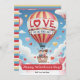 Envía deseos para el Día de San Valentín a alguien especial con esta linda tarjeta de felicitación. La ilustración es de una pareja sonriente en un globo aerostático con la leyenda 'El amor está en el aire'. El globo de rayas rojas, rosadas y amarillas está rodeado de corazones de amor, cielo azul y nubes blancas. Debajo del globo está el mensaje 'Feliz Día de San Valentín' en tipografía de letra elegante, seguido de espacio para agregar tu propio texto. La parte trasera de la tarjeta tiene rayas en colores similares a la imagen del frente.