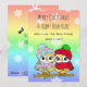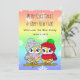 Adorables búhos él y ella dibujados a mano, sentados en una rama de árbol en invierno con hermoso fondo de copos de nieve rosados, azules y verdes. Agregue su saludo personalizado y nombres en el área de personalización. Tarjeta de Navidad LGBTQI.