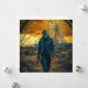 Una figura solitaria con una máscara de gas camina hacia el espectador, colocada en el fondo de un parque de atracciones abandonado con una destacada noria bajo un espectacular cielo naranja. Alambre de púas enmarca la escena, mejorando la atmósfera post-apocalíptica.
