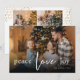 Esta tarjeta plana doble faz de Navidad con paz, amor y alegría presenta tipografía de letra moderna y un collage de 3 fotos en la parte posterior. Inserta tus fotos favoritas, agrega un toque personal con tu propio mensaje sincero y personalízala a tu gusto. Fotos de prostooleh / Freepik.