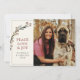 Esta elegante tarjeta de Navidad "Paz, Amor y Alegría" presenta un moderno y minimalista diseño de acuarela con follaje verde y bayas rojas sobre un fondo neutro, y una foto de usted y su amigo peludo en la parte frontal. Un borde gris delgado enmarca la tarjeta en la parte delantera y trasera. Esta tarjeta se personaliza fácilmente con su elección de saludo, apellido y año, así como el texto en la parte trasera. Debajo de sus nombres hay un corazón rojo y una huella de pata adorable.