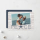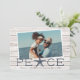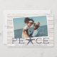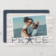 La tarjeta fotográfica de vacaciones en la playa con un toque rústico muestra una sola foto sobre un fondo de madera clara, con "paz" debajo de una suave tinta azul marino. Una estrella de mar ocupa el lugar de la letra "A" para un bonito toque costero. Personalice con sus nombres, el año y un saludo de vacaciones, y añada una foto adicional y un mensaje personal a la parte posterior si lo desea.