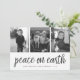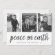Una tarjeta de vacaciones moderna y elegante diseñada para alojar tres de tus fotos favoritas alineadas una al lado de la otra en moda en blanco y negro. "Paz en la Tierra" aparece debajo de un guión de estilo manuscrito negro, con sus nombres y/o mensajes personales debajo. Las tarjetas cambian a un sutil patrón botánico de rama de olivo en gris claro y blanco.