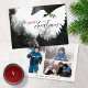 Estas tarjetas de felicitación para Navidades planos de 7" x 5" presentan una paloma abstracta en tonos negros, blancos y rojos. "Feliz Navidad" en negro y rojo junto con una rama de olivo verde. Personalizar con su apellido y año. La parte trasera tiene tres fotos, un retrato, dos paisajes.