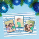 Hermosas líneas onduladas azul celeste decoran el fondo de esta moderna tarjeta de Navidades de fotografía familiar. Personalice sus fotos familiares las 5 horas, los 7 días de la semana y reemplace las 3 fotografías con sus propios hijos felices. La tarjeta perfecta de Navidades de la familia de la playa que lee PEACE LOVE JOY en la tipografía azul moda al lado de cada foto. Personalizar la parte de atrás con tu propio mensaje y los nombres de los miembros de tu familia para una brillante y alegre tarjeta de saludo de vacaciones. Usa 3 fotos de colores en esta carta de Navidades alegres.