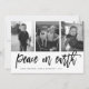 A modern and chic holiday card designed to accommodate three of your favorite photos aligned side by side in timeless black and white. "Peace on Earth" appears beneath in black handwritten style brush script, with your names and/or personal message beneath. Cards reverse to a subtle botanical olive branch pattern in pale gray and white.