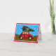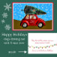 Tarjeta de felicitación de vacaciones divertidas. Dos perros, un golden retriever conduciendo y un husky montando en la parte trasera con un gorro de punto amarillo. Los alegres cachorros navideños están en camino, en su pequeño auto tipo escarabajo, transportando su árbol de Navidad a casa para las vacaciones. El árbol es un árbol de cepillo de botella vintage. El auto es de un rojo brillante de bastón de caramelo y tiene Felices Fiestas en el lateral. El fondo tiene un cielo azul brillante con copos de nieve que caen. La felicitación dentro está preestablecida pero se puede cambiar fácilmente. Una cadena de luces de Navidad recorre la tarjeta, separando la felicitación de vacaciones de su nombre. En la parte trasera hay una plantilla para que agregue el año.