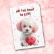 La parte delantera de esta linda tarjeta El día de San Valentín tiene una imagen de un adorable cachorro de perro con el Poodle blanco sosteniendo un corazón rojo. El texto de arriba dice "Todo lo que necesitas es amor" El interior completa el pensamiento, y también dice "Feliz Día de San Valentín". Todo el texto, el frontal y el interior pueden ser personalizados a cualquier otra cosa que prefieras.