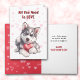 La parte delantera de esta linda tarjeta El día de San Valentín tiene una imagen de un adorable perrito Husky Siberiano sosteniendo un corazón rojo. El texto de arriba dice "Todo lo que necesitas es amor" El interior completa el pensamiento, y también dice "Feliz Día de San Valentín". Todo el texto, el frontal y el interior pueden ser personalizados a cualquier otra cosa que prefieras.