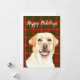 Tarjeta de vacaciones con ilustración de acuarela de Labrador Retriever sobre fondo de cuadros festivos verdes y rojos, y saludo de vacaciones personalizable.