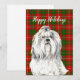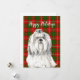 Tarjeta de Fiesta con ilustración en acuarela de Lhasa Apso sobre fondo escocés festivo verde y rojo y saludo de Fiesta personalizable.