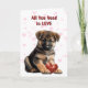La parte delantera de esta linda tarjeta El día de San Valentín tiene una imagen de un adorable cachorro pastor alemán sosteniendo un corazón rojo. El texto de arriba dice "Todo lo que necesitas es amor" El interior completa el pensamiento, y también dice "Feliz Día de San Valentín". Todo el texto, el frontal y el interior pueden ser personalizados a cualquier otra cosa que prefieras.