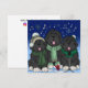 Tarjeta hermosa dibujada y coloreada a mano que presenta tres cachorros de perro de Terranova cantando villancicos de Navidad, vestidos con trajes invernales lindos en la nieve