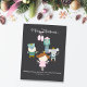 Personajes adorables de cascanueces, el príncipe cascanueces, el reloj de pie, el rey ratón y el hada de azúcar. Los zapatillas de bailarina cuelgan del saludo de Feliz Navidad en la parte superior. Saludo personalizable en la parte inferior junto con el nombre de la familia y el año. Colores pastel y fondo gris oscuro.