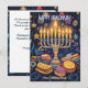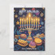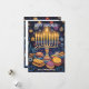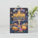 Esta tarjeta de saludo de Hanukkah es una celebración vibrante del Festival de las Luces, que presenta una menorah bellamente ilustrada con velas brillantes contra un cielo nocturno azul profundo. Alrededor de la menorah hay símbolos festivos como dreidels, gold coins (gelt) y sufganiyot (donut rellenos de gelatina), todo añadido a la alegre atmósfera. El fondo está salpicado de estrellas y adornos que realzan el ambiente festivo.