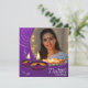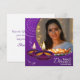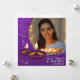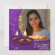 Comparte la alegría y la luz de Diwali con nuestra tarjeta personalizada de saludo en blanco y violeta que incluye diya brillante, una mandala blanca, imagen de una hermosa mujer con un plato lleno de diyas brillantes y "Feliz Festival Diwali de la Luz" escrito con un moderno tipo de letra blanca en un fondo morado. Puede cambiar fácilmente la imagen con la foto de su o de sus seres queridos haciendo clic en el botón "personalizar".