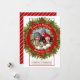 Tarjeta de saludo clásica de personalizable con guirnaldas de pino y guirnaldas de pino en temporada invernal de diciembre. Personalizar con una foto de su elección y personalizado con el nombre y la fecha del año, y dé a sus amigos o familia una botella personalizada de regalo de vino para las vacaciones.