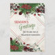 Única, clásica, moderna, bonito y decorativa tarjeta de vacaciones corporativa. Cute el texto de bienvenida de Happy Holidays y habitación para personalizar o personalización con un mensaje de su elección en la parte trasera de la tarjeta. Enmarcado por bayas rojas de vino de Borgoña y ramos de flores de color verde oscuro sobre un elegante fondo de madera con aspecto de shiplap.