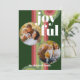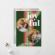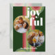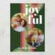 Tarjeta de saludo de temporada de Navidades clásicos contemporáneos con un patrón abstracto de color verde claro y oscuro, rosa y rojo con un texto de deseo JOYFUL blanco y crujiente. Con espacio para personalizar o personalización con dos fotos, un nombre de familia (o nombres individuales) en la parte delantera, y un mensaje de bienvenida de temporada de personalizable en el reverso de la tarjeta.