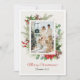 Capture the spirit of the season with this stunningly elegant Christmas card template, featuring a beautiful watercolor illustration of festive red flowers, holly berries, and lush green winter foliage/greenery. The perfect backdrop for your favorite family photo!