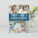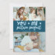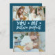 Whimsical and modern Valentine's Day photo template card featuring a typography text that says "You + Me = Picture Perfect" with 3 of your pictures. You can add another picture and a message on the back of the card. Teal.