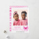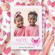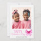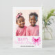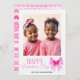Pink bow with hearts stripes Valentine's Day photo Holiday Card. This card features a family photo and a pink coquette bow with magenta hearts. The cheerful phrase "Happy Valentine's Day" blends script and decorative typography. The back reveals an appealing pattern of irregular pink, magenta and white stripes, playfully scattered with hearts.