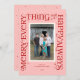 This modern festive holiday card features the words "merry everything and a happy always" framed around a single photo on the front. It has space for a second photo on the back. The front of the card also has space for your name and the year.