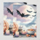 Una escena caprichosa de Halloween en acuarela que presenta una luna llena grande y brillante rodeada de nubes suaves. Una calabaza tallada con una cara alegre se sienta junto a calabazas más pequeñas. Varios murciélagos revolotean por el cielo, realzando la atmósfera espeluznante. El ambiente general es festivo y encantador, capturando el espíritu de Halloween. Diseñado por la artista Danguole Serstinskaja.