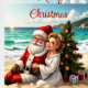Una caprichosa escena navideña que presenta a Santa Claus y una mujer en un vestido blanco, sentados en una playa de arena. Santa, con su traje rojo icónico y barba blanca, sonríe cálidamente mientras se apoya en un árbol de Navidad decorado.