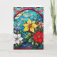 Cuatro poinsettias, uno rojo, uno rosa, uno blanco y uno amarillo en un diseño de vitral. Un fondo en tonos de azul y un arco que es rojo sólido en la parte inferior y rosa, púrpura y blanco en la parte inferior.