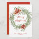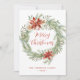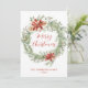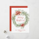 Elegante tarjeta de Navidades florales con "Feliz Navidad" en un guión rojo rodeado por una corona de poinsettias de color rojo color agua, rosas crema, boughs de pino, bayas huecas y otras zonas verdes invernales. Personalice la parte delantera de la tarjeta de Navidades no fotográficos con su apellido y el año que se muestra a continuación en letras rojas. En la parte trasera de la rústica tarjeta de vacaciones aparece tu mensaje personal con letras blancas.