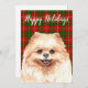 Tarjeta de vacaciones con ilustración al acuarela de perro Pomerania en fondo de cuadros festivos verdes y rojos y saludo de vacaciones personalizable.